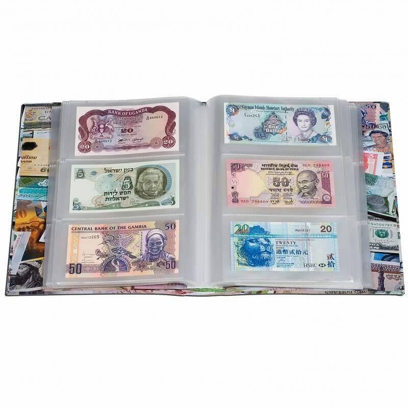 Hochwertiges Album mit 100 festeingebundenen, transparenten Hüllen für 300 Banknoten. Besonderer Schutz der Banknoten durch 100 % säure - und weichmacherfreie Hüllen. Attraktive, fröhliche Optik des Albums durch farbige Banknotenmotive aus aller Welt. Praktisch und unempfindlich durch wischfesten Einband.